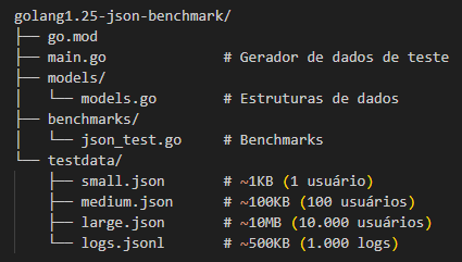 Montar um benchmark decente exige usar dados que fazem sentido. Esqueça aqueles exemplos de tutorial com {"name": "John"}. Usei estruturas de usuário completas, com perfil, timestamps, roles, metadados, informações que remetem cenarios reais.