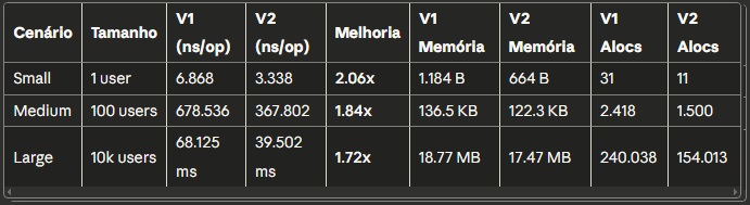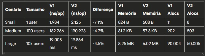 No payload pequeno (um usuário), o v1 levou 1.984ns contra 2.125ns do v2. No payload médio (100 usuários), foram 182.266ns contra 190.923ns. E no grande (10 mil usuários), 19ms contra 19,8ms. A diferença de tempo é pequena, mas a economia de memória é real. O v1 alocou 8.2MB no teste grande, enquanto o v2 ficou em 6MB. São quase 2MB a menos, com metade das alocações.